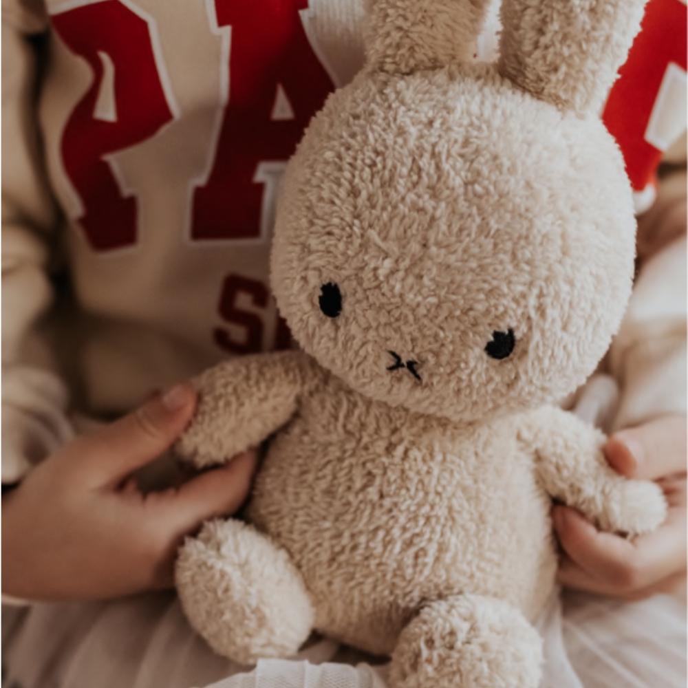 Crafted with care and sustainability in mind, the Miffy Sitting Terry Plush is handcrafted using at least 90% recycled materials and filled with 100% recycled PET polyester. The premium terry fabric feels luxuriously soft, making it especially comforting for little ones during nap time, bedtime, or quiet moments. Its sitting design allows it to be both a cuddly toy and a charming nursery display piece.
